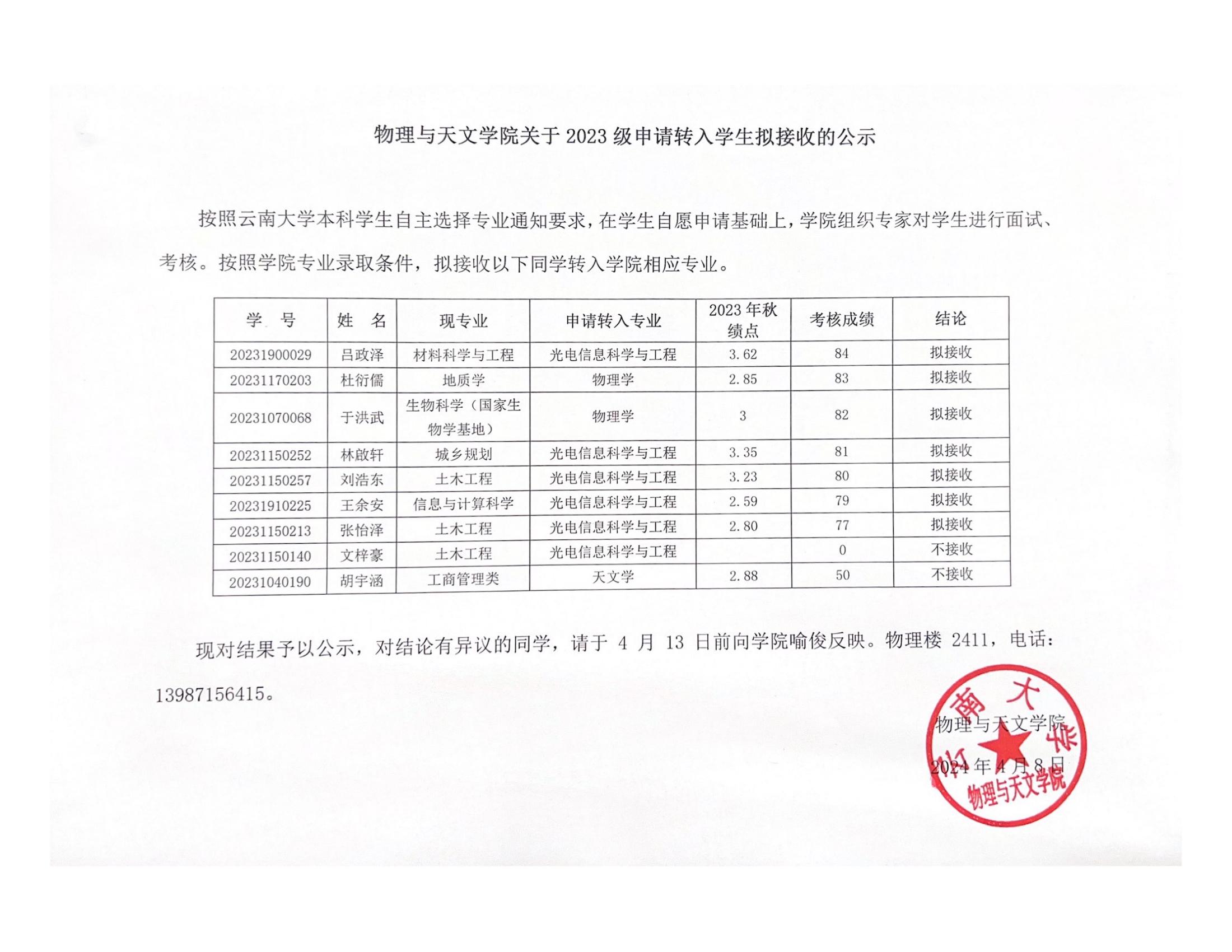 物理与天文学院关于2023级申请转入学生拟接收的公示