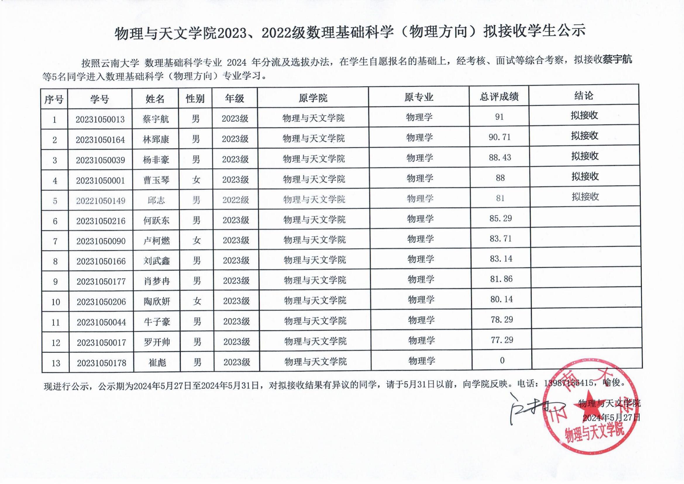物理与天文学院2023、2022级数理基础科学(物理方向)拟接收学生公示