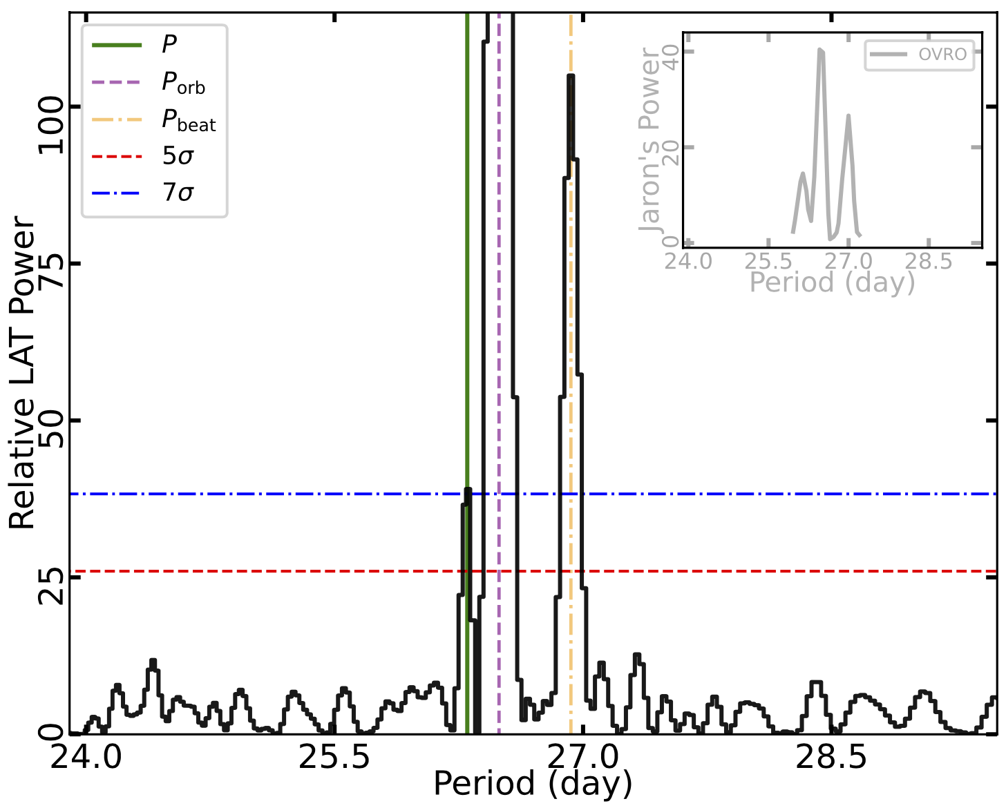 图2:LS I +61°303伽马射线电磁波辐射光变的频谱。其中紫色虚线表示该系统的轨道周期、黄色的点虚线是拍频周期,
