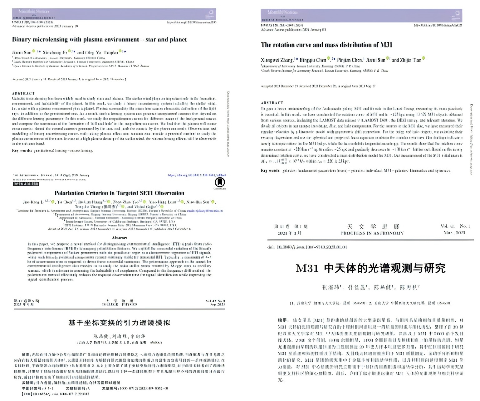 近年来,《大学物理A:力学》《大学物理C》入选省级线上下混合式一流课程,《宇宙线地面探测虚拟仿真实验》《太阳活动的仿真实验》入选省级虚拟仿真实验课程,《大学物理A:光学》入选校级线上线下示范课程;《大学物理实验》教材将于年内出版;“物理实验教学层次化创新设计及应用”获2022年度云南省教学成果奖二等奖。