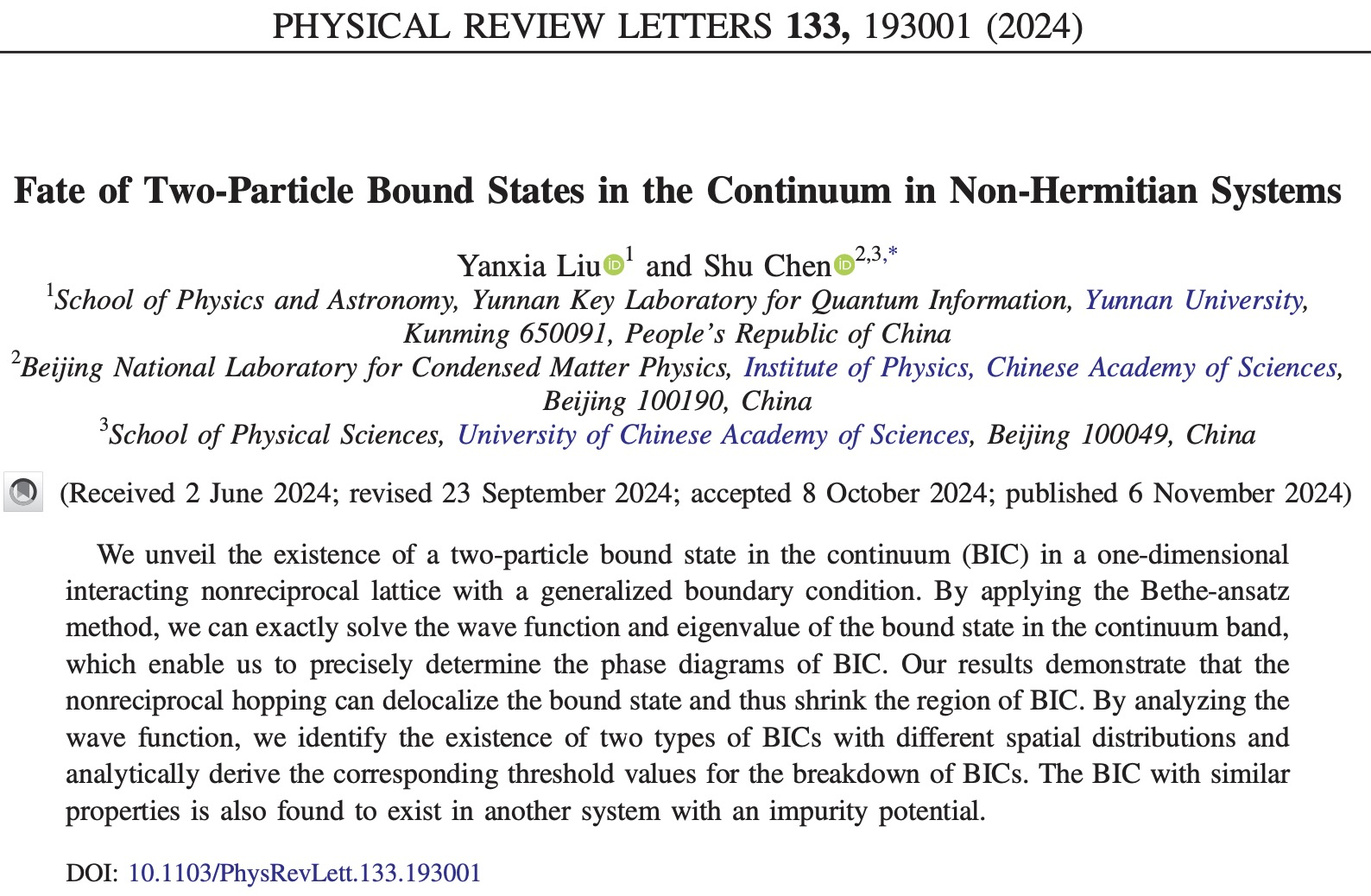 近日,学院刘彦霞副研究员和中科院物理所的陈澍研究员共同在国际物理学顶级期刊 Physical Review Letters(PRL)发表题为“Fate of Two-Particle Bound States in the Continuum in Non-Hermitian Systems”的研究论文。PRL的前身为《Physical Review》,创刊于1893年,1913年由美国物理学会接管并增设快报专栏,1958年独立成为PRL,迅速成为全球物理学界公认的权威期刊。