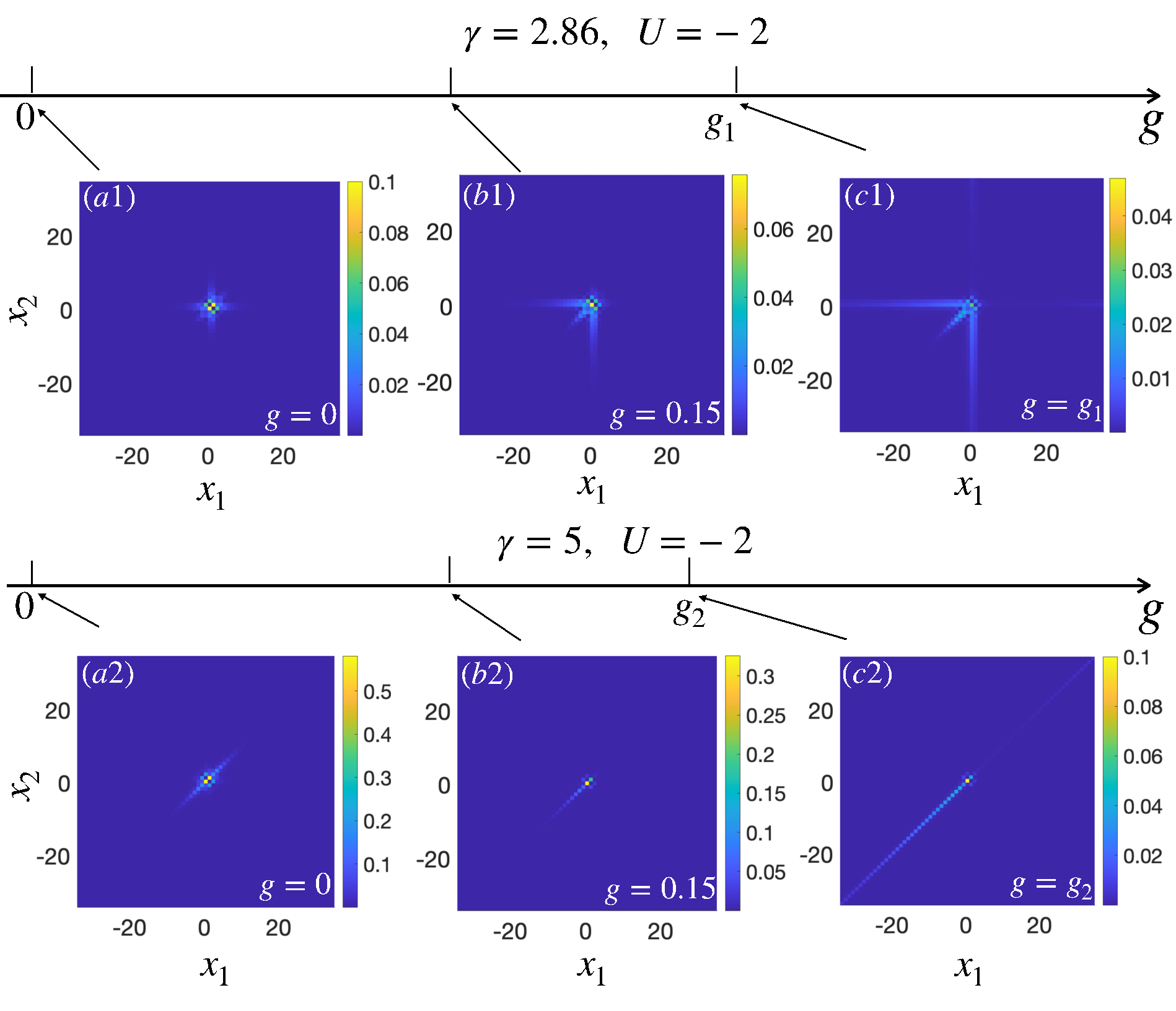 由于以往关于BIC的研究大多集中在非相互作用的厄米系统上,非厄米相互作用系统中BIC的形成机制尚不清楚。刘彦霞和陈澍研究员解析地研究了一维相互作用非厄米系统中的BIC,揭示了非互易跃迁项对连续谱中的束缚态(BIC)命运的影响机制。他们通过具体研究具有广义边界条件或杂质势的非互易两粒子相互作用晶格模型,尽管该模型是不可积的,但通过类似Bethe-ansatz 的方法,他们精确地给出该模型中BIC的波函数和本征值,从而准确绘制出BIC的相图。研究结果显示,非互易跃迁项会导致束缚态不再局域,进而缩减BIC形成区域的范围。通过对波函数的分析,他们发现了两种具有不同空间分布的BIC的存在,并解析地推导出了导致BIC不存在的临界值。他们的解析结果为理解非厄米系统中BIC的命运提供了坚实基础。