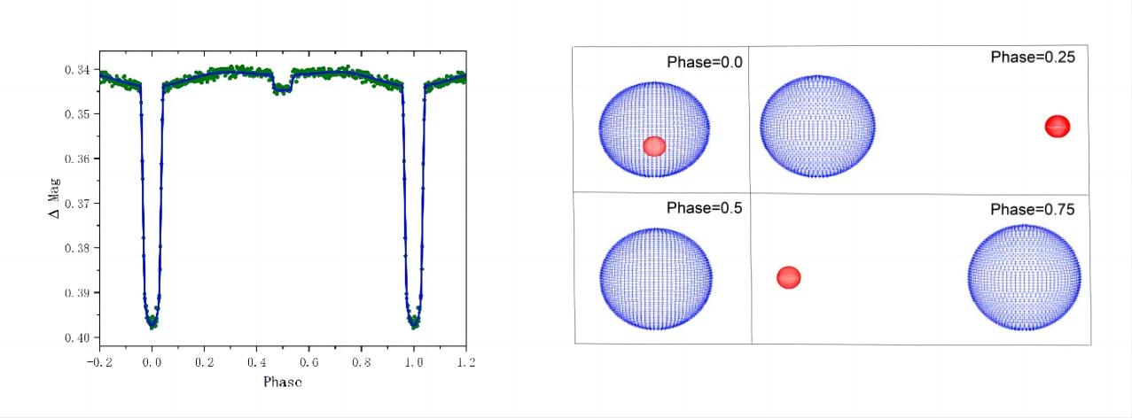 船帆座KV的前身天体是由大质量的B型主星和小质量的M型红矮星次星组成的极小质量比双星系统。然而由于次星非常暗弱,其亮度对整个系统的贡献不到1%,这样的双星极为难于发现。探测小质量星对大质量星的掩食成为唯一有效的方法。为了搜寻这样的特殊系统,团队利用我国LAMOST光谱巡天数据和欧洲航天局研制的盖亚(Gaia)空间卫星数据,并结合TESS所提供的高精度连续测光数据开展系统分析与研究。成功发现了一系列含暗弱伴星的B型小质量比双星。其中名为TIC 260342097的双星系统质量比仅为0.067,这意味着主星的质量是次星的约15倍。图2(左)展示的是目标双星TIC 260342097TESS光变曲线。从图可以看出,光变曲线的振幅很小,不到0.06个星等。图2(右)展示了TIC 260342097的两子星几何位型,其中蓝色表示B型主星,红色表示暗弱M星红矮星伴星。这种罕见的极端质量比B型双星系统为理解双星系统的形成与演化提供了宝贵的信息,揭示了这一系统是由盘破裂过程形成,丰富了人们对双星系统形成路径的认识,也为研究双星的后续演化提供了新的视角。