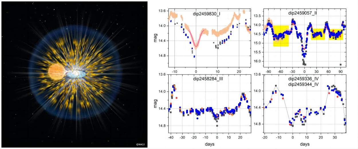 图4 激变变星爆发的艺术图(左图;图片来自NAOJ)和Karachurin 12不同类型的周期性变化的模式(右图)。