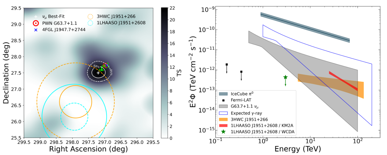 图1:左图是分析IceCube数据得到的中微子辐射的显著性天图,TS值越大表明探测越显著。红色圆圈是G63.7+1.1的位置,白色虚线是中微子辐射的位置误差范围,绿色的线是周围分子云的分布情况,橙色和青色圆圈是附近的两个TeV伽马射线源。右图是中微子和伽马射线能谱。灰色区域是G63.7+1.1的中微子能谱误差范围,橙色和红色区域是两个TeV源的伽马射线能谱误差范围。