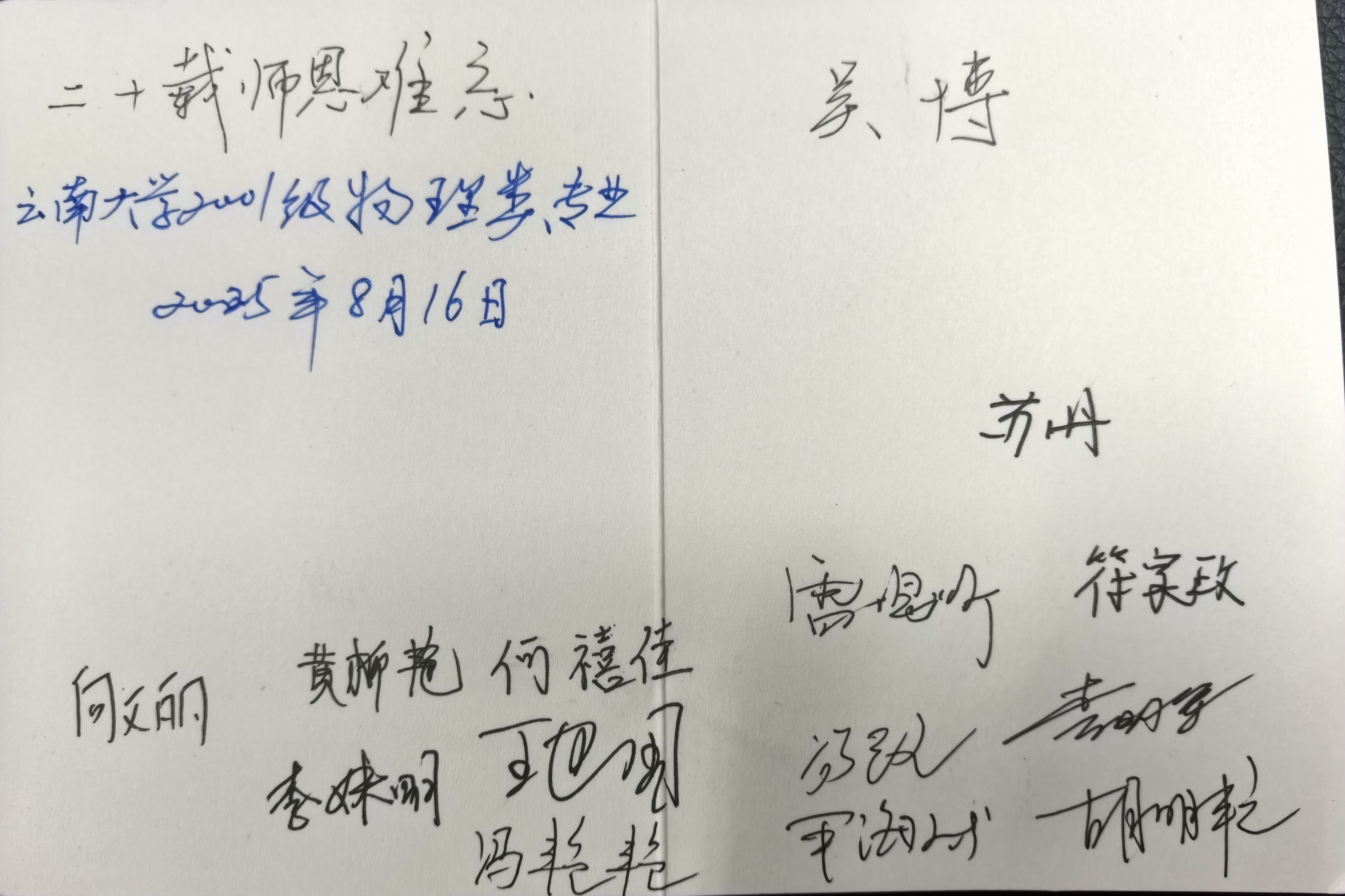 各位校友依次向老师们汇报了自己毕业二十年来的学习、生活和工作历程。时光改变了当年的青涩模样,却未曾改变深厚的师生情谊和物理人独有的精神底色。尽管大家如今活跃在教育、科研、行政管理和企业等截然不同的行业领域,但“云大物理人”的烙印早已深深融入血脉。大家纷纷感慨,是母校的培养赋予了大家严谨的逻辑思维、强大的学习能力和不畏艰难的探索精神,这成为大家在各自岗位上砥砺前行、取得成就的坚实基础。
