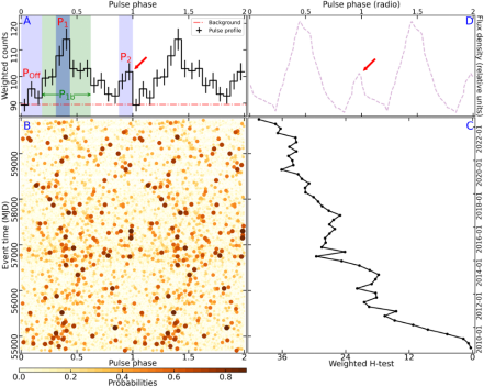 图1:毫秒脉冲星J1835−3259B的脉冲分析结果。A、伽马射线光子概率加权的脉冲轮廓,P1b和P2分别对应伽马射线的脉冲辐射部分,POff为考虑的非脉冲辐射部分。B、伽马射线光子加权事例的时间随相位变化图,颜色表示每个伽马光子来自J1835−3259B的概率。C、判断脉冲探测置信度的H-test值随观测时间的变化结果。D、国际报道的此脉冲星射电脉冲轮廓(红色箭头用于标出一个子脉冲结构,同样可见于伽马脉冲轮廓)。