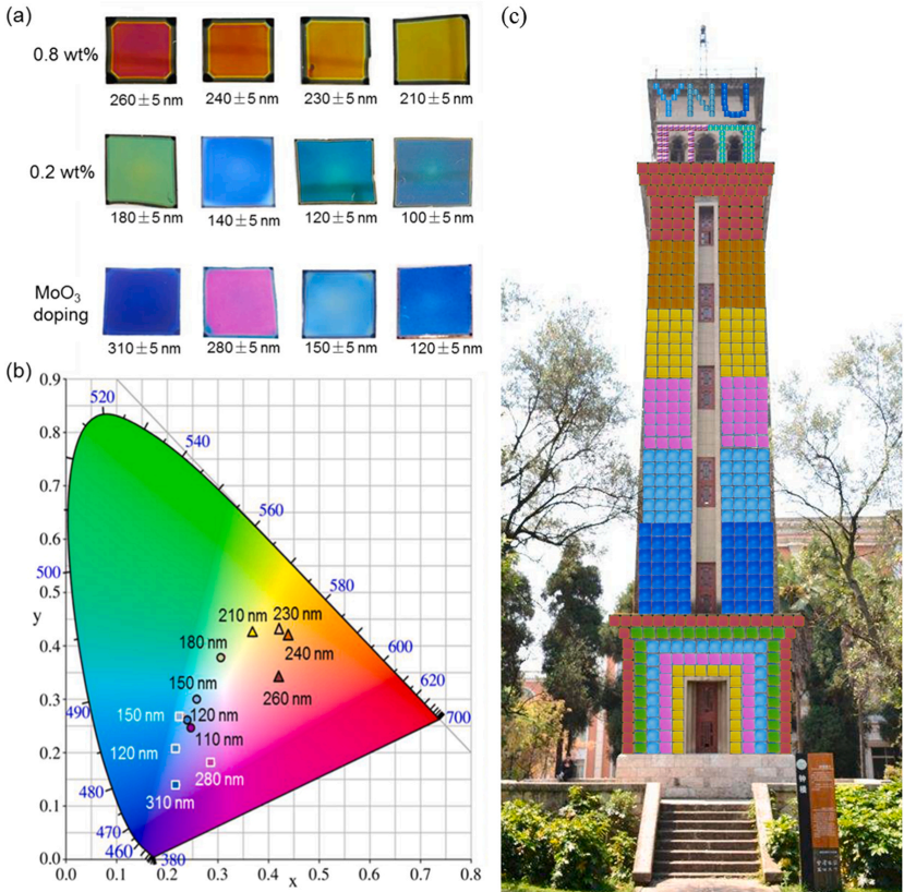 发表论文配图4 (a)实验制成的彩色PEDOT:PSS/Si太阳能电池的照片;(b) CIE 1931色度空间中器件颜色的色坐标;(c) 装饰有彩色太阳能电池必一运动(官方网站)B·Sport-权威运动资讯网站钟楼(软件模拟)