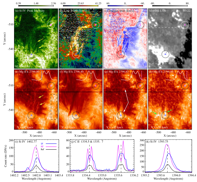 图2.(a) - (c) 基于单次高斯拟合得到的Si IV 1393.75 Å谱线参数图(峰值强度、线宽、多普勒速度)。(d) HMI视向磁图(±80 G)。(e) - (h):Mg II k线在不同波长的成像图。 (i-k) 暗条南/北足点(蓝/紫色方框)及参考区(黑色虚线框)的光谱线。图中黄色箭头标示网络场喷流;白色箭头对指示暗条内部流动;绿色箭头指向低色球增亮。