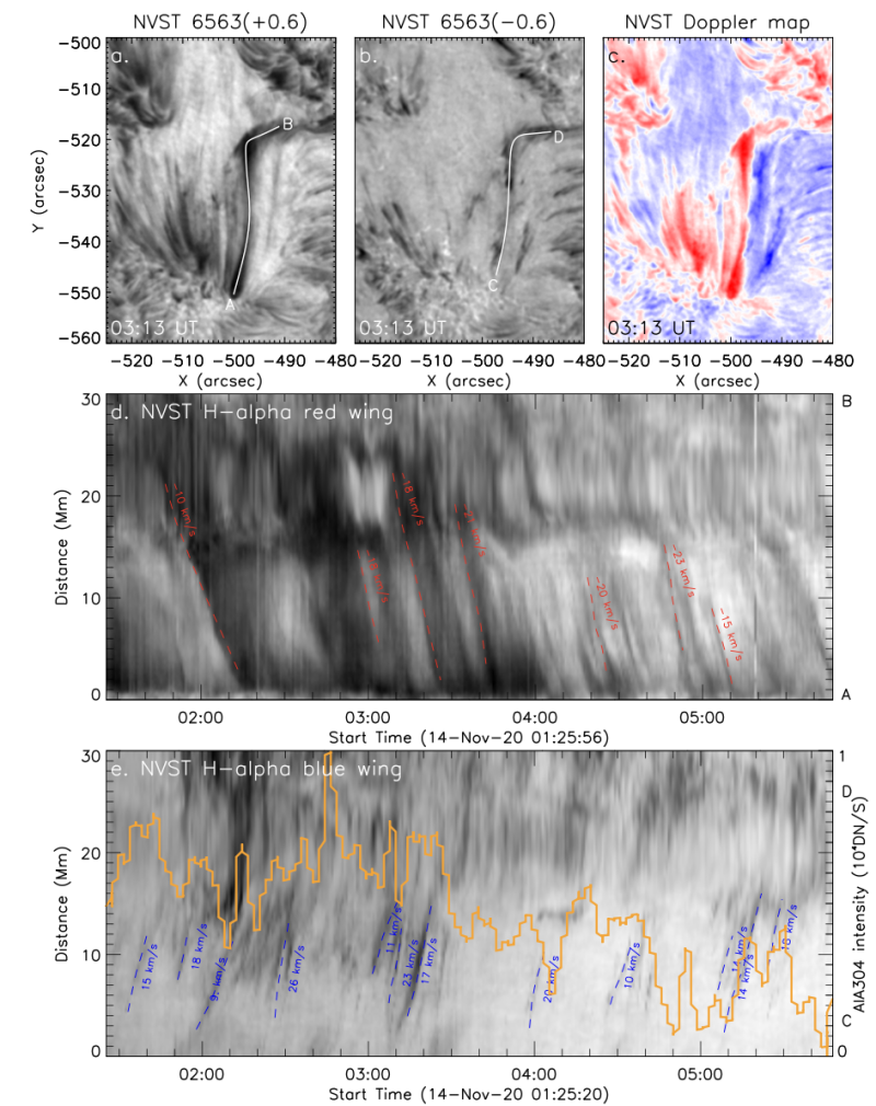图1.(a)NVST Hα红翼图像;(b)蓝翼图像;(c)由红翼与蓝翼合成的多普勒图。(d)为沿(a)中AB路径的时距图,显示下行物质流,平均速度约18 km/s;(e)为沿(b)中CD路径的时距图,显示上行物质流,平均速度约16 km/s。图中橙色曲线为南足点区域304 Å波段EUV辐射强度的归一化通量。