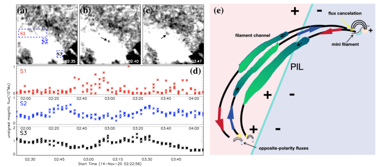 图3.(a)–(c)为HMI视向磁图(±20 G);(d)展示了从(a)中选取的三个小区域S1–S3的磁通量随时间变化;(e)为根据观测构建的物理过程示意图。