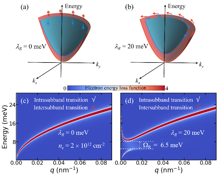 图1 在一定电子浓度下,单层二硫化钼 K 谷的导带能带结构示意图及对应的电子能量损失函数。(a) 和 (c)表示未考虑 RSOC的情况;(b) 和 (d) 则对应存在 RSOC时的情况。红色与蓝色箭头分别代表不同能带中的自旋取向。当引入 RSOC 后,等离激元光学支底部与声学支顶部之间出现一个最小能量差 ΩR,该能量差可作为 RSOC 的光谱指纹特征。