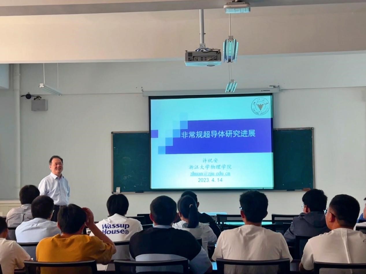报告首先介绍了超导体的基础知识和典型的应用,高温超导体的反常之处,以及目前的最新进展。同时,报告介绍了许教授从事超导电性研究以来取得的主要成果:(1)铜氧高温化合物超导体的Nernst效应与位相涨落图像;(2)铁基高温超导新体系探索和一批新的非常规超导体的发现;(3)拓扑超导体探索,包括其发现的非中心对称超导体InxTaSe2,高阶插层的新超导体Pb(TaSe2)2和界面超导新体系。报告结束后,许教授与现场师生进行了探讨,并就大学生如何进行相关研究等方面进行了详细解答。